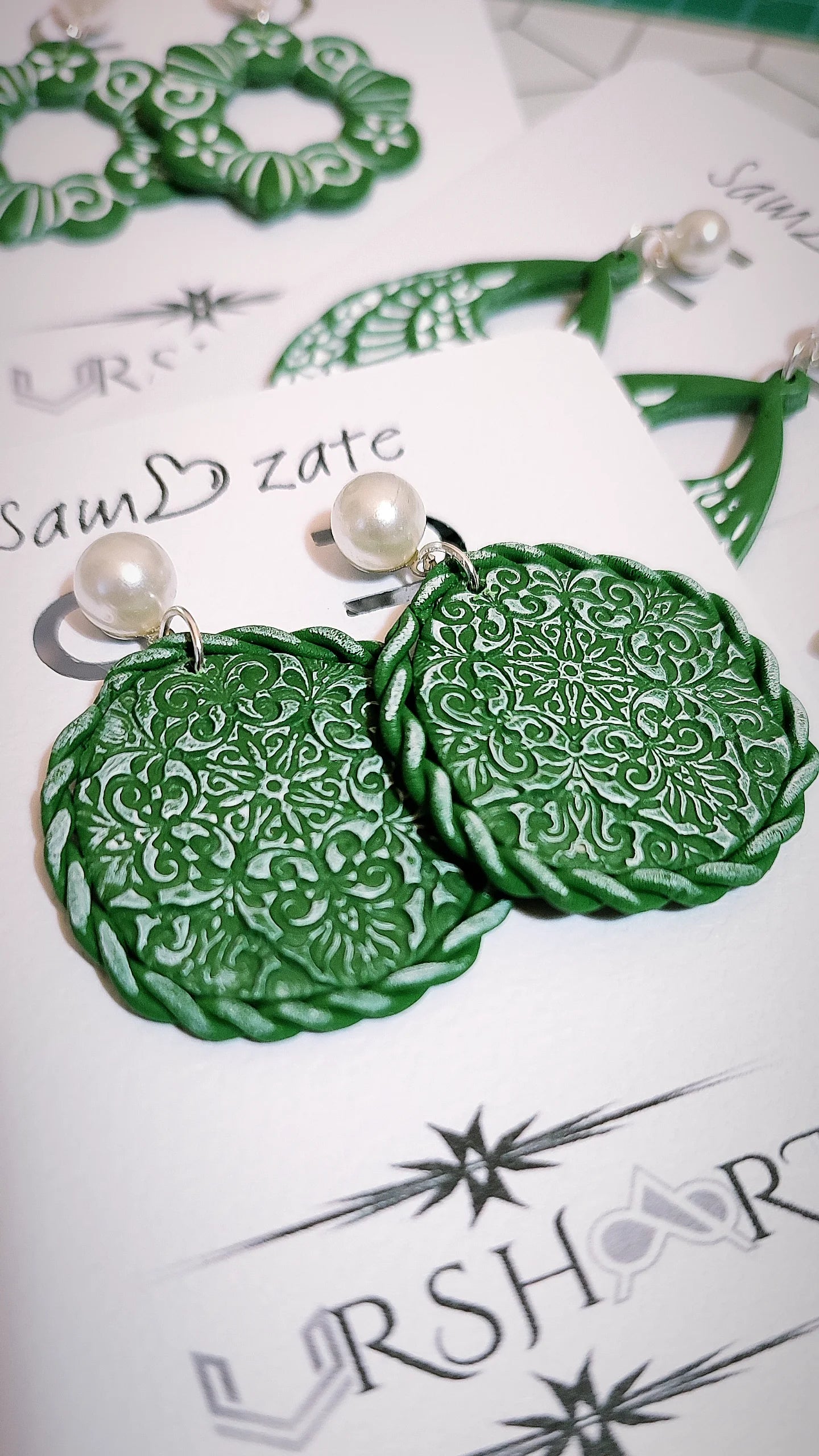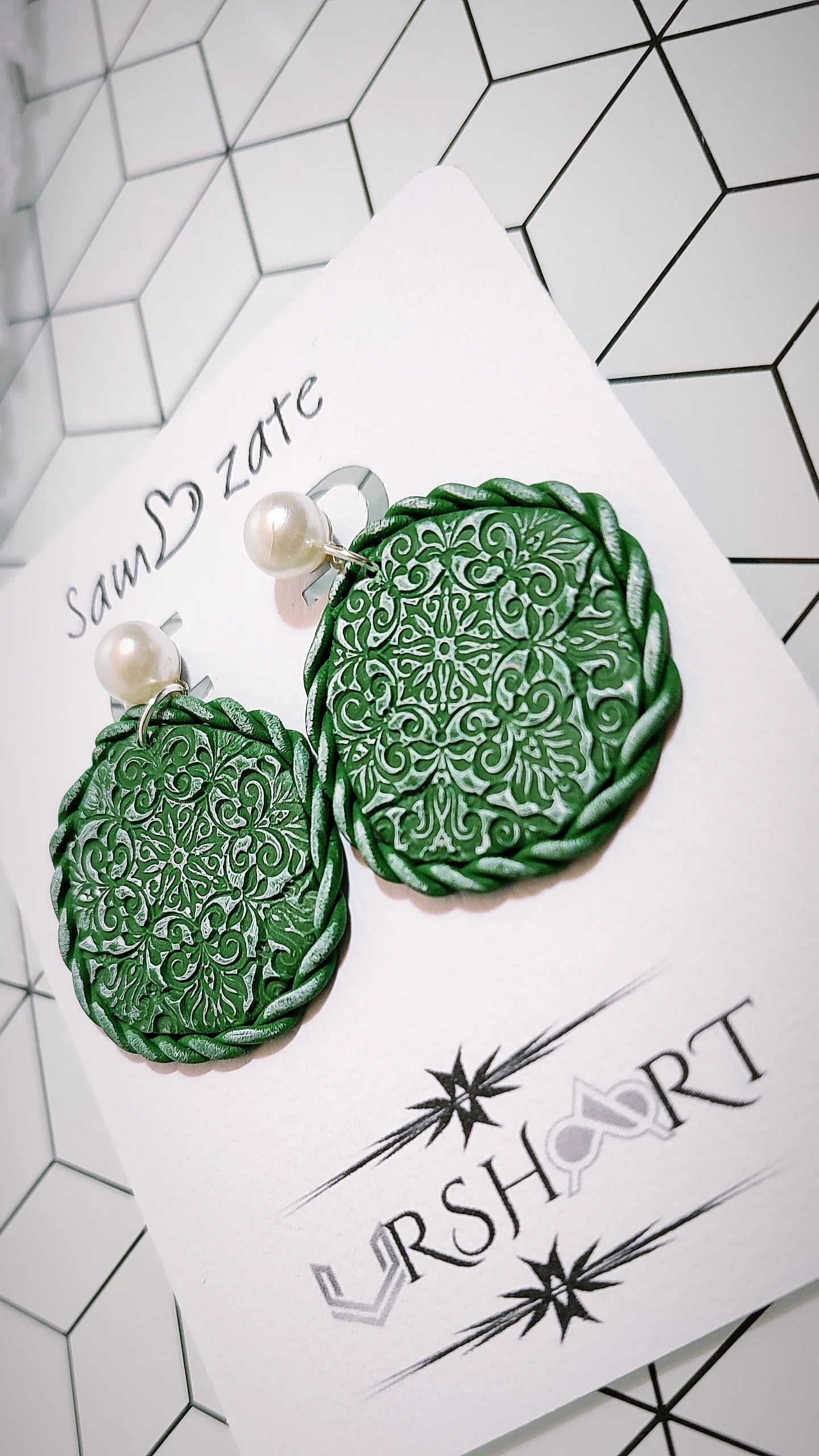 These exquisite handmade earrings feature circular green polymer clay charms detailed with a braided-edge design and ornamental patterns, evoking timeless craftsmanship. Accented with soft pearl-like studs, they exude a refined yet earthy elegance—perfect for adding a graceful, artisan touch to both everyday and special occasion looks. A unique blend of tradition and creativity, thoughtfully made just for you. 💚✨