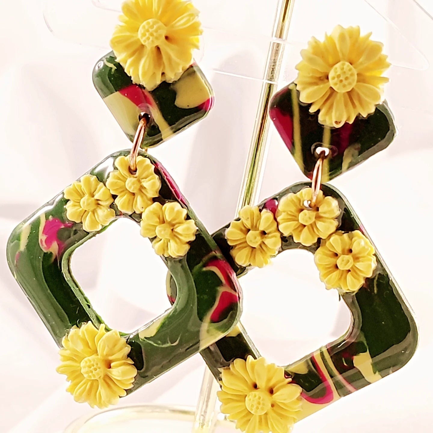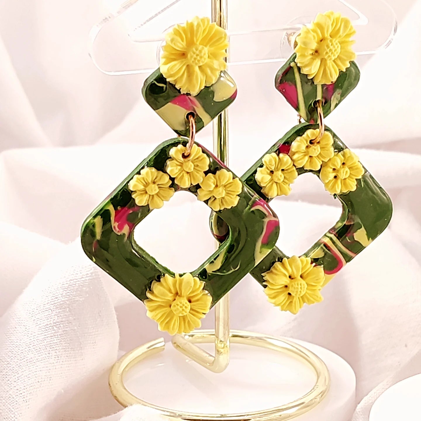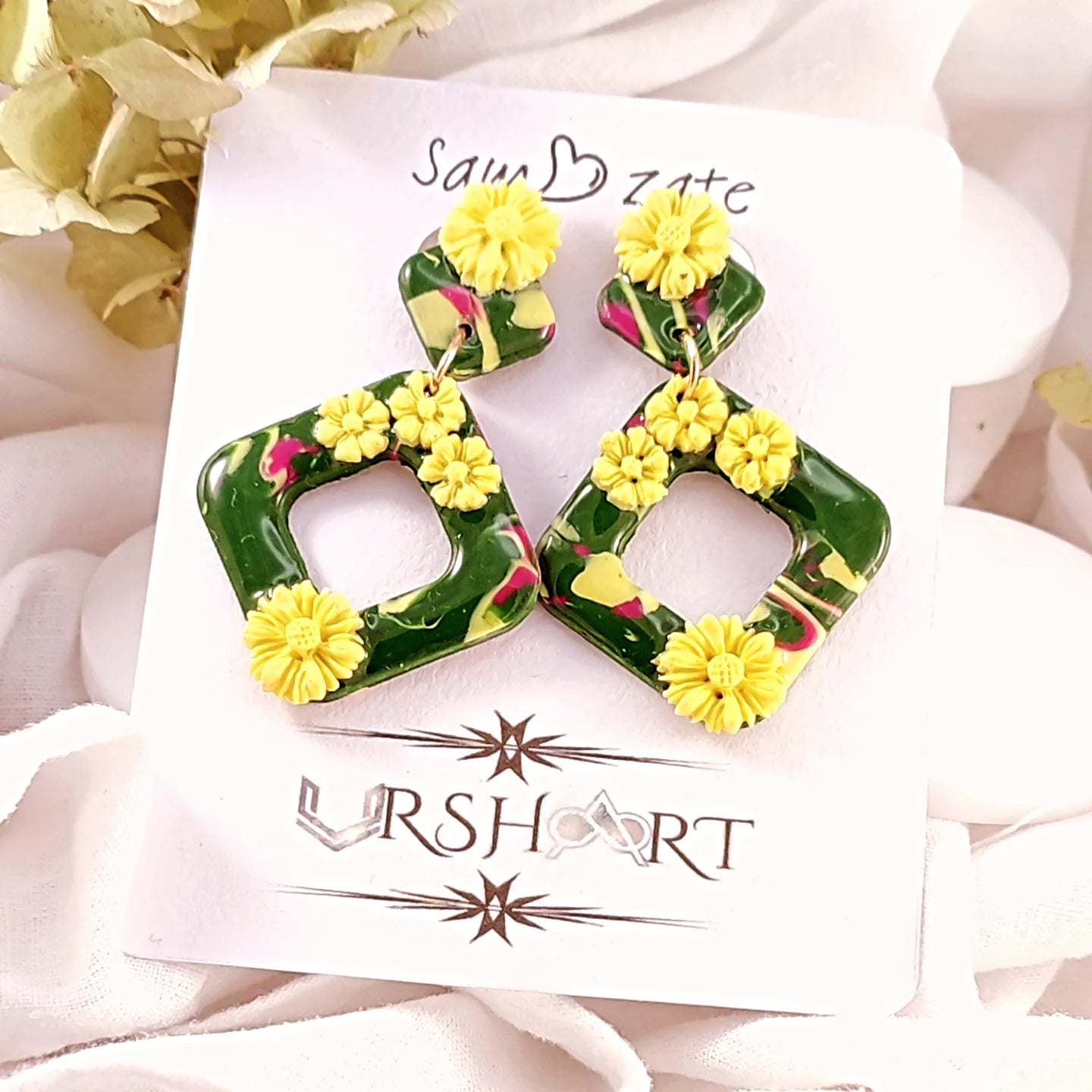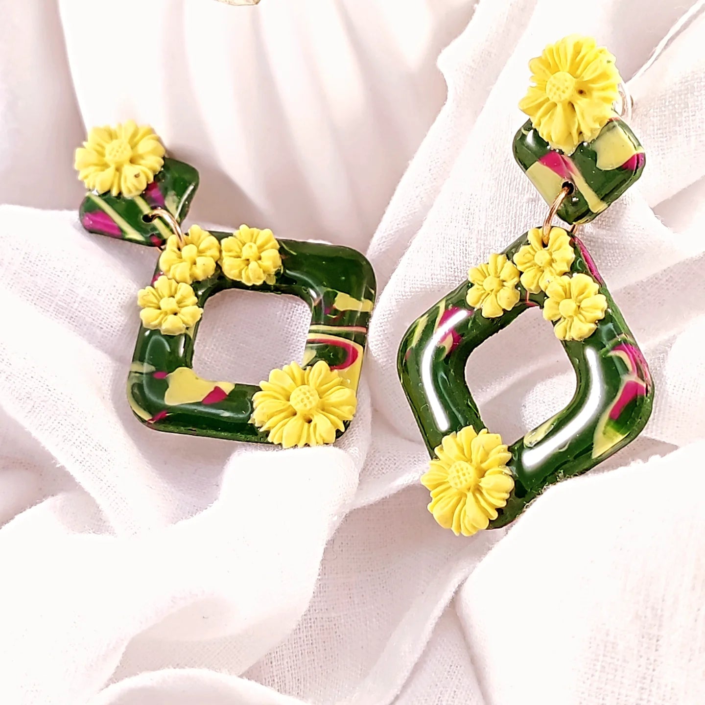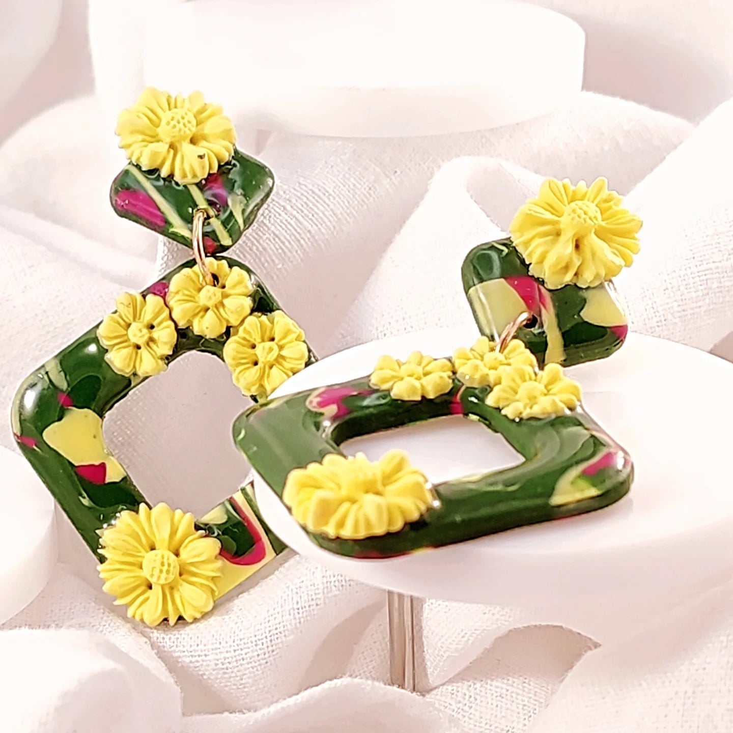 Add a touch of elegance and charm to your accessory collection with our handmade polymer clay earrings. These stunning earrings feature a beautiful combination of green, yellow and pink, making them perfect for color and flower loving ladies.