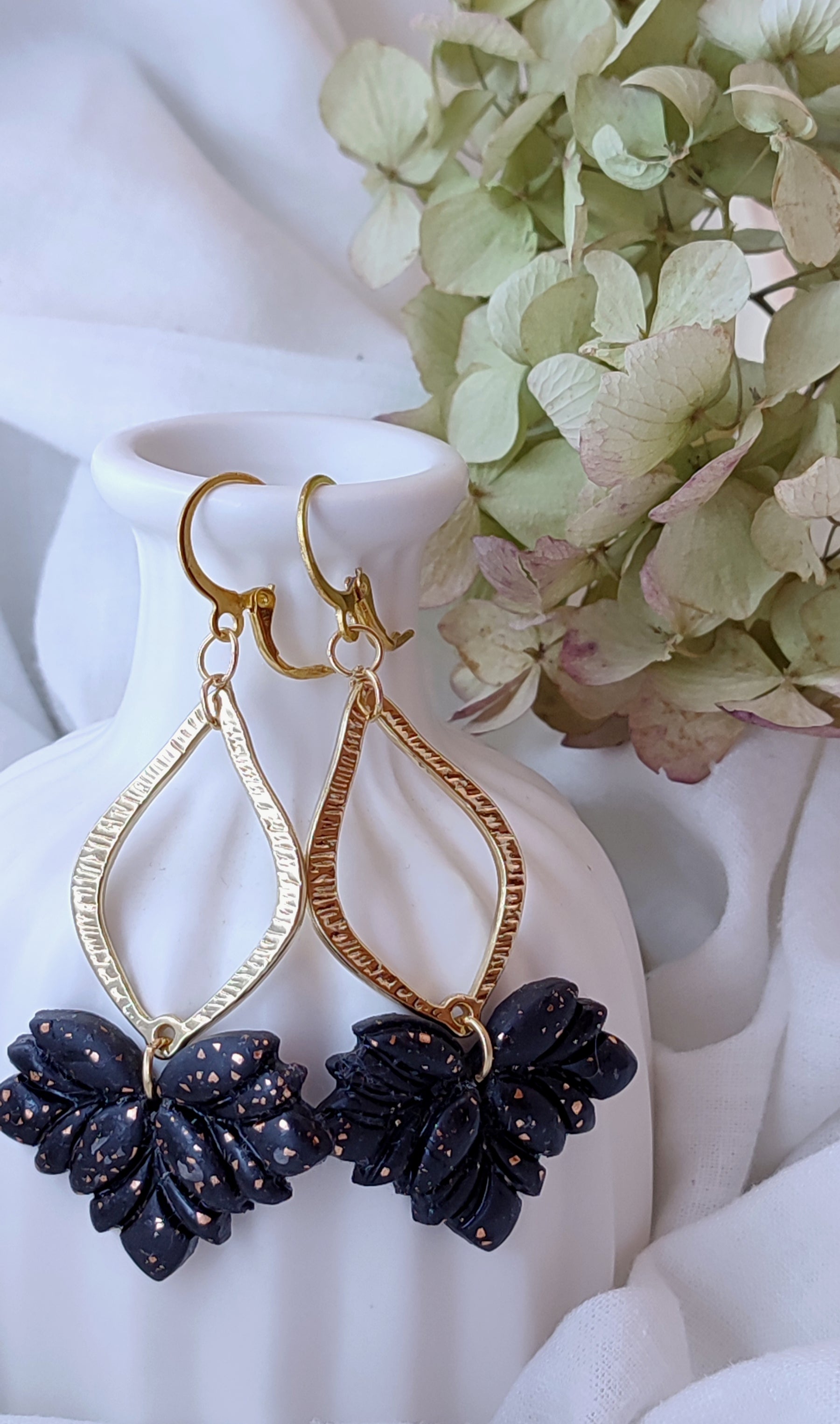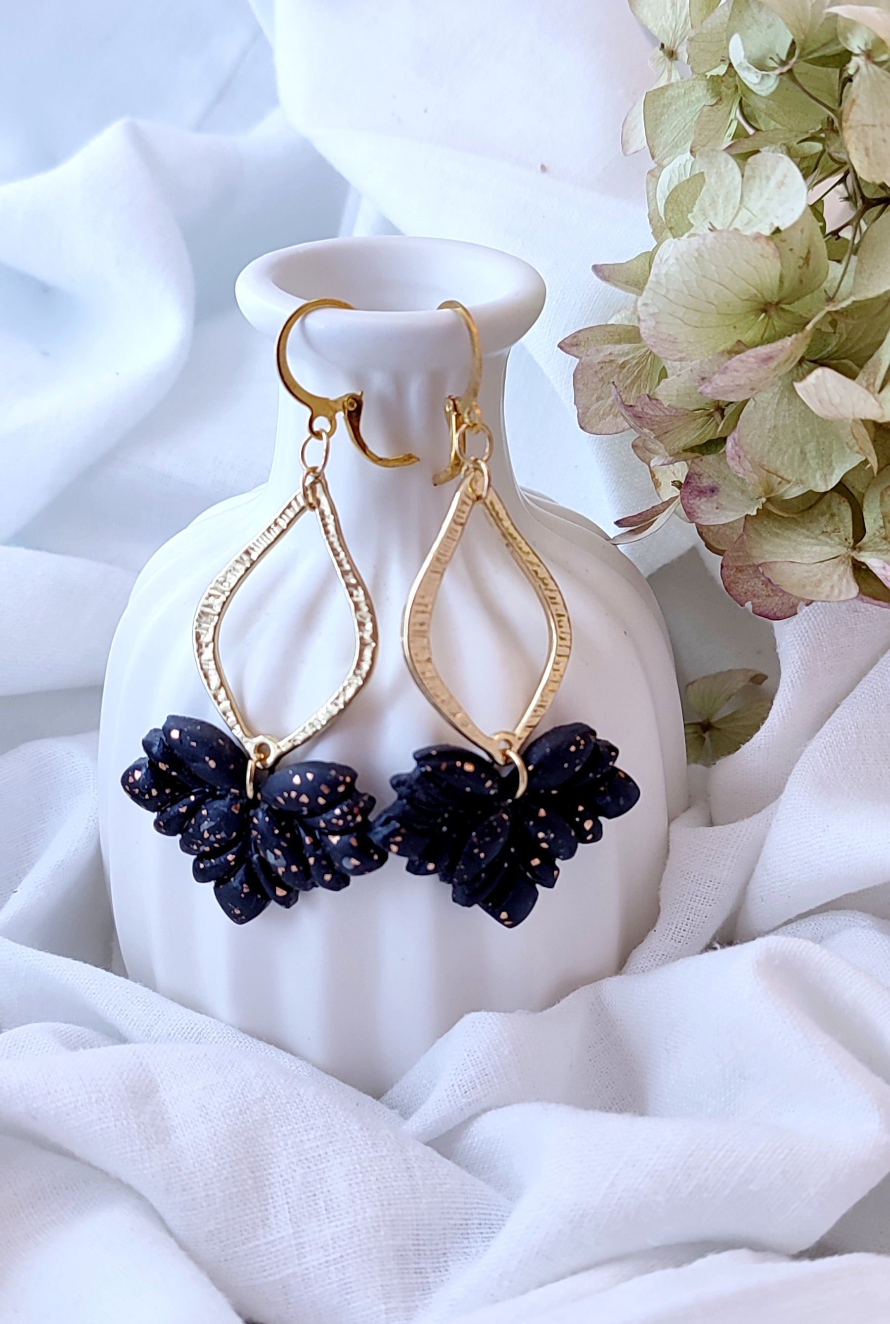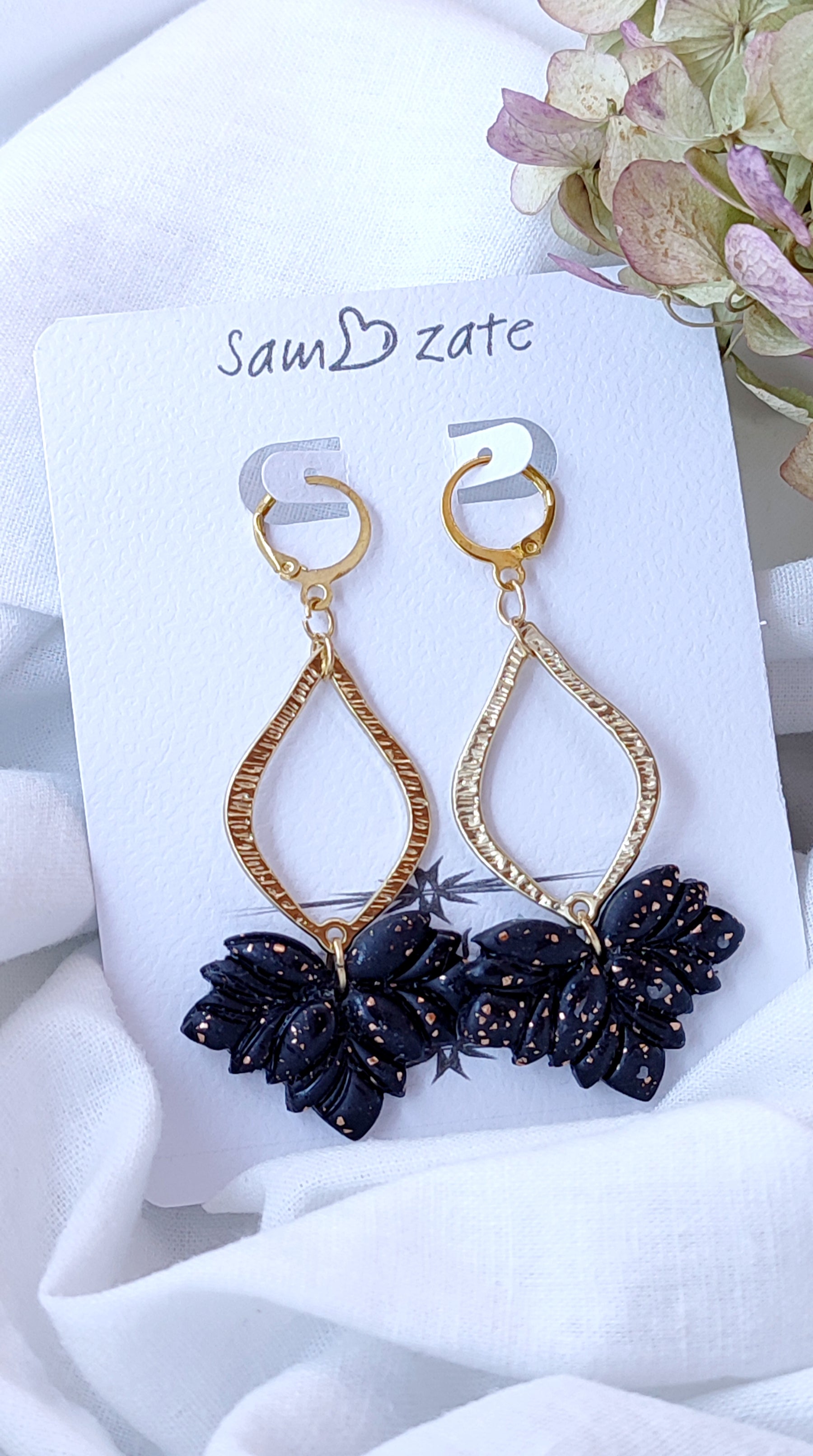 Add a touch of elegance and charm to your accessory collection with our handmade polymer clay earrings. These stunning earrings feature a beautiful combination of black and gold, making them perfect for any occasion.