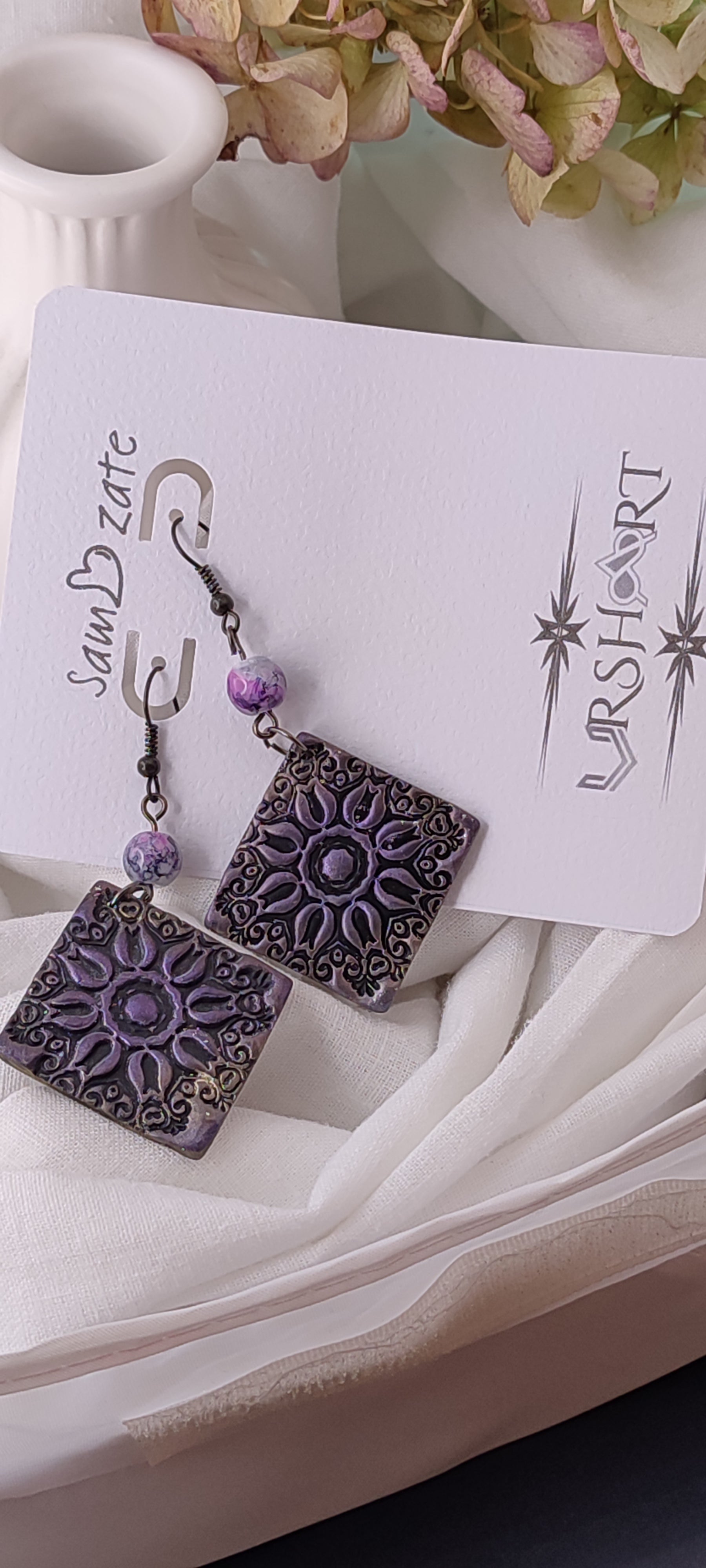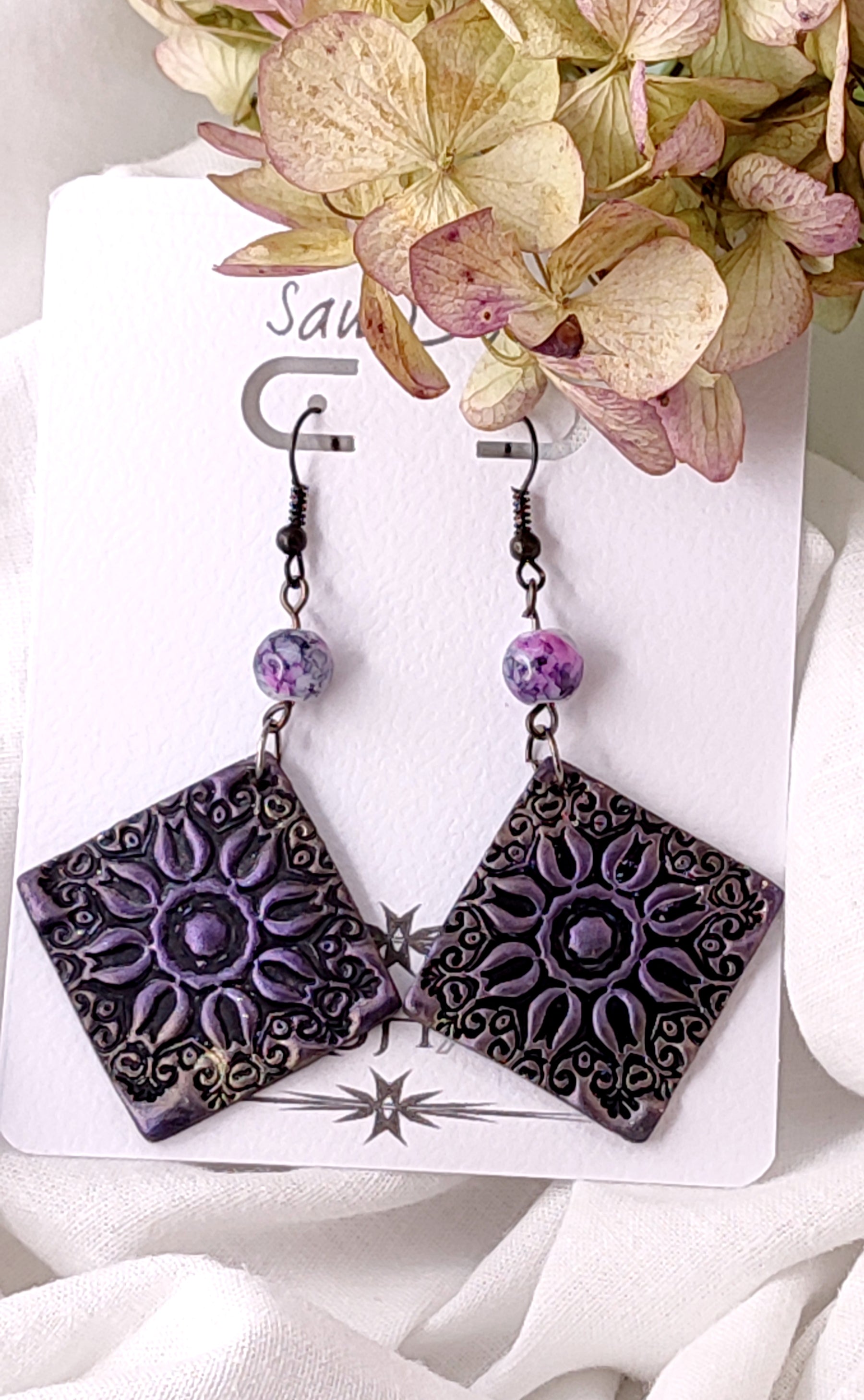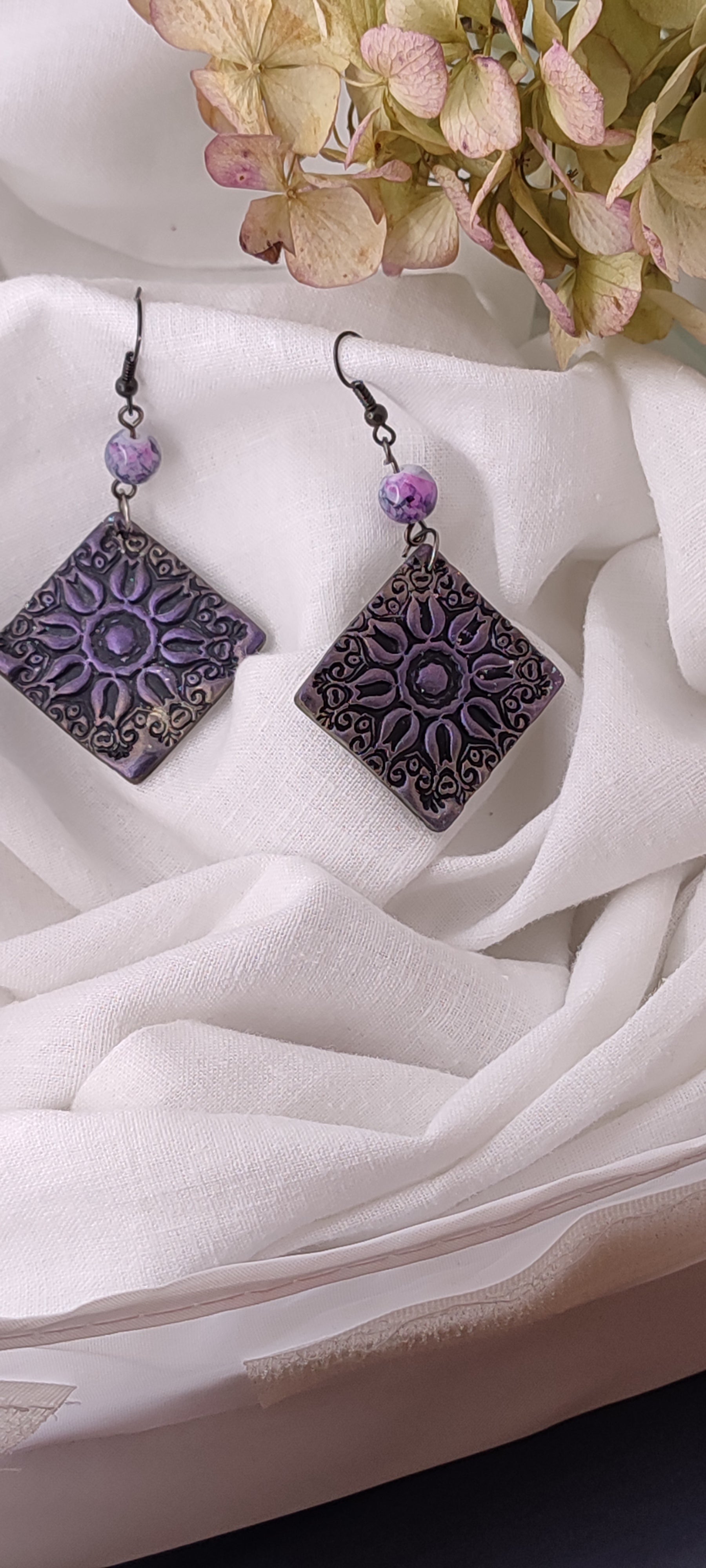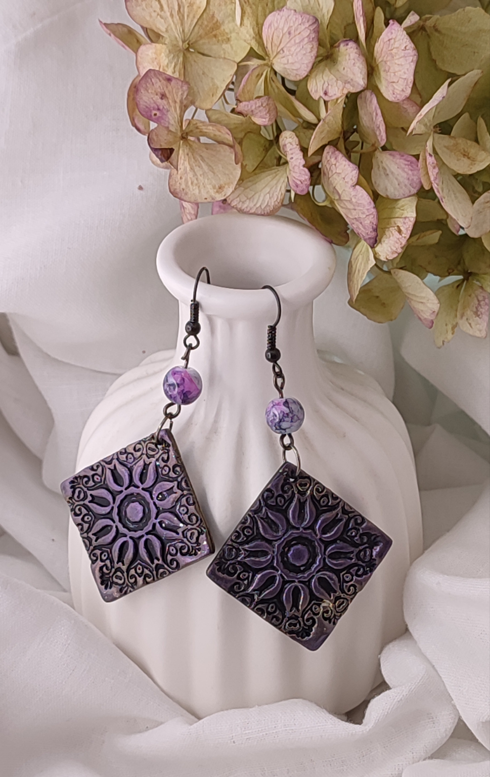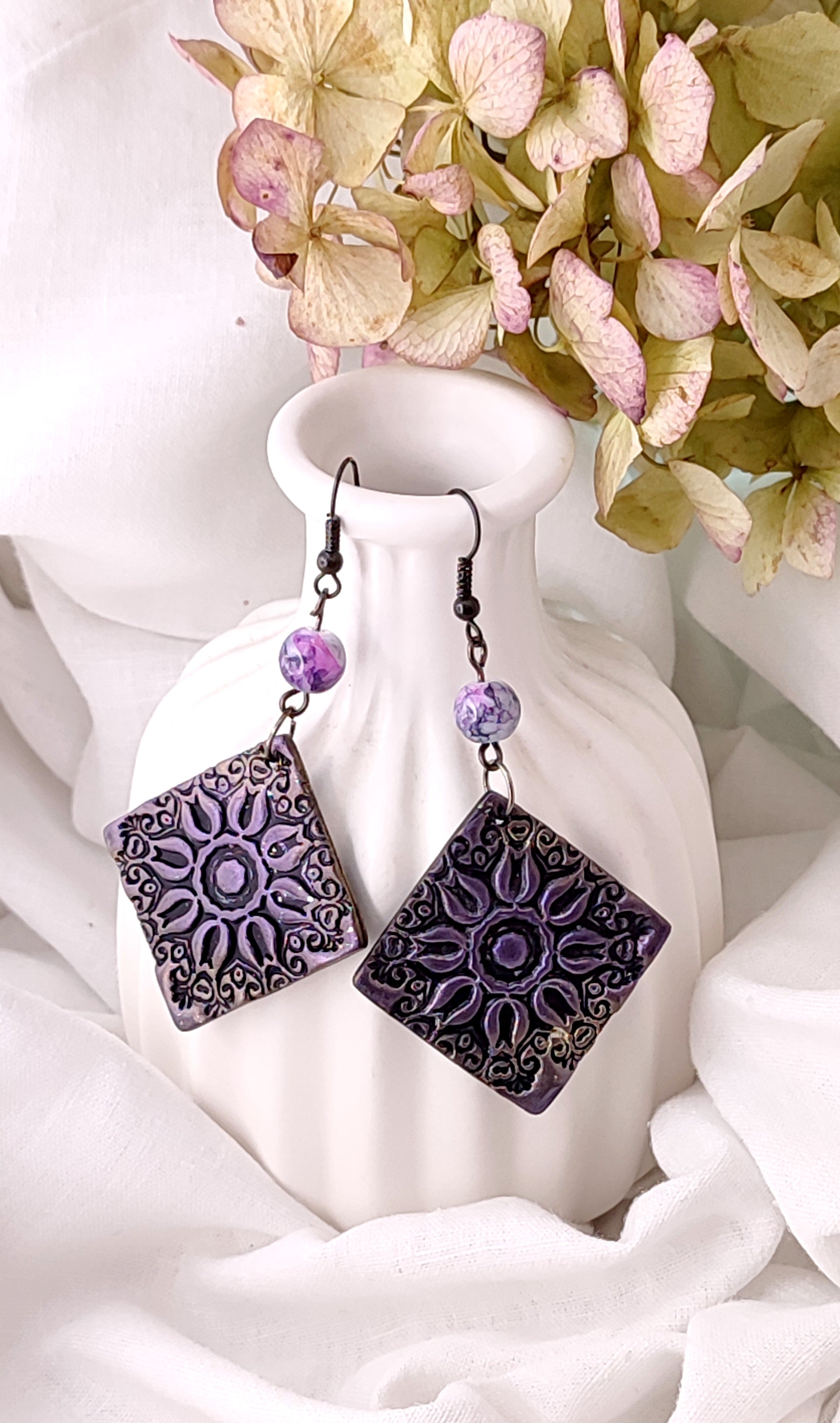 Add a touch of sophistication and charm to your accessory collection with our handmade polymer clay earrings. These stunning earrings feature a beautiful combination of purple, black, and silver, making them perfect for any occasion.